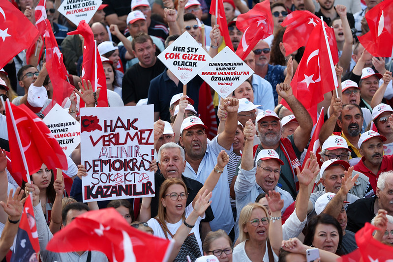 “Bugün çiftçi üretiyor ama kazanamıyor. Çiftçinin ürettiğini asgari ücretli, emekli alamıyor. Bir yanda servetine servet katanlar var, diğer yanda her geçen gün biraz daha yoksullaşanlar var. Türkiye tarihinin en büyük gelir adaletsizliğini yaşıyoruz. Yıllardır hep o yıllarla anılan krizler vardı. Hatırlayın 94 krizi, 2001 krizi, 2008 krizi gibi. Bu krizler o yıl, bilemediniz takip eden yıl atlatılır geçerdi. Ancak 2018’den beri Türkiye bir krizin içine girdi ve çıkamıyor. Çünkü krizin yılla ilgisi yok. Krizin getirilen sistemle ilgisi var. Bu krizin bir tane sorumlusu var. ‘Her şeyi ben bilirim’ diyen, ‘Ben ekonomistim’ diyen, ‘Dış politikayı ben bilirim’ diyen, çiftçiye, üreticiye had bildiren, herkese sataşan, tepeden bakan, tek adam, tek adam Erdoğan. Bu krizin tek sorumlusudur. Bu yüzden Türkiye’nin içinde bulunduğu kayıp yıllardan kurtulmak için, ileriye umutla bakabilmek için, buğdayını üretip de sattığında borcunu kapatabilmek için, borçlu kalmamak, faiz altında ezilmemek için, ürettiğin sütten para kazanmak için, besicilikten para kazanmak için, ayçiçeği üretince para kazanmak için bu iktidarın değişmesi lazımdır, değişmesi şarttır. Bunun için buradan hep bir ağızdan sesleniyoruz: Ey Erdoğan, Ey Erdoğan. Ben halkım. Ben milli iradeyim. Adayımı bırak, sandığı getir. Adayımı yanımda, sandığı önümde görmek istiyorum. Sandık gelecek, bu iktidar gidecek. Ve Cumhurbaşkanı Ekrem İmamoğlu olacaktır.”
